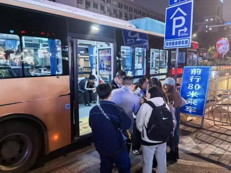 国庆假期,游客王女士急切地向唐韵专线执勤人员询问:“你好,我们想去大唐不夜城,能坐这个车吗?”执勤人员耐心解答着乘客们的问题。