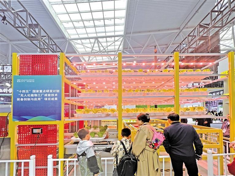 10月25日,第32届杨凌农高会D馆珠海益品农业科技有限公司展台前人头攒动,无人化植物工厂吸引了不少参会者驻足观看。