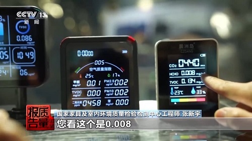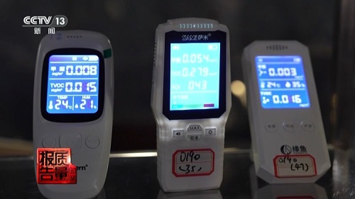 国家家具及室内环境质量检验检测中心工程师 张新宇:我们可以看到在不同品牌的便携式甲醛检测仪屏幕上显示值是不一样的,有的显示HCHO(甲醛),有的就是写甲醛。您看这个是0.008,这个是0.03,已经差了40倍了。这是0.6,这个是0.005,现在就差了将近有100倍了。