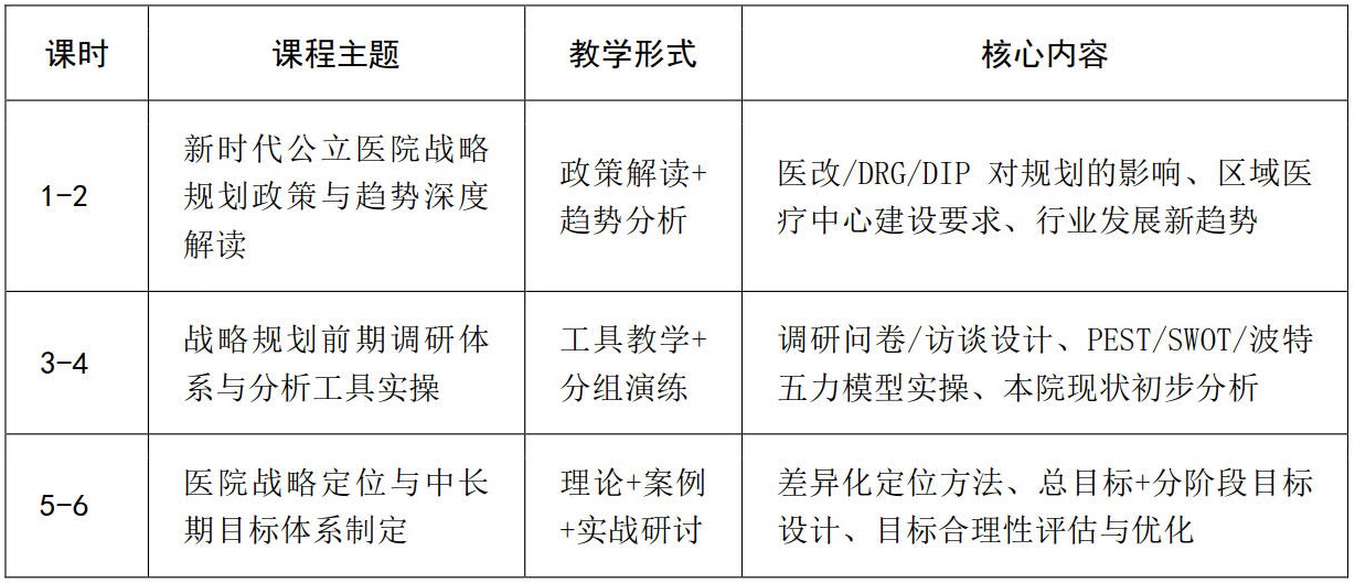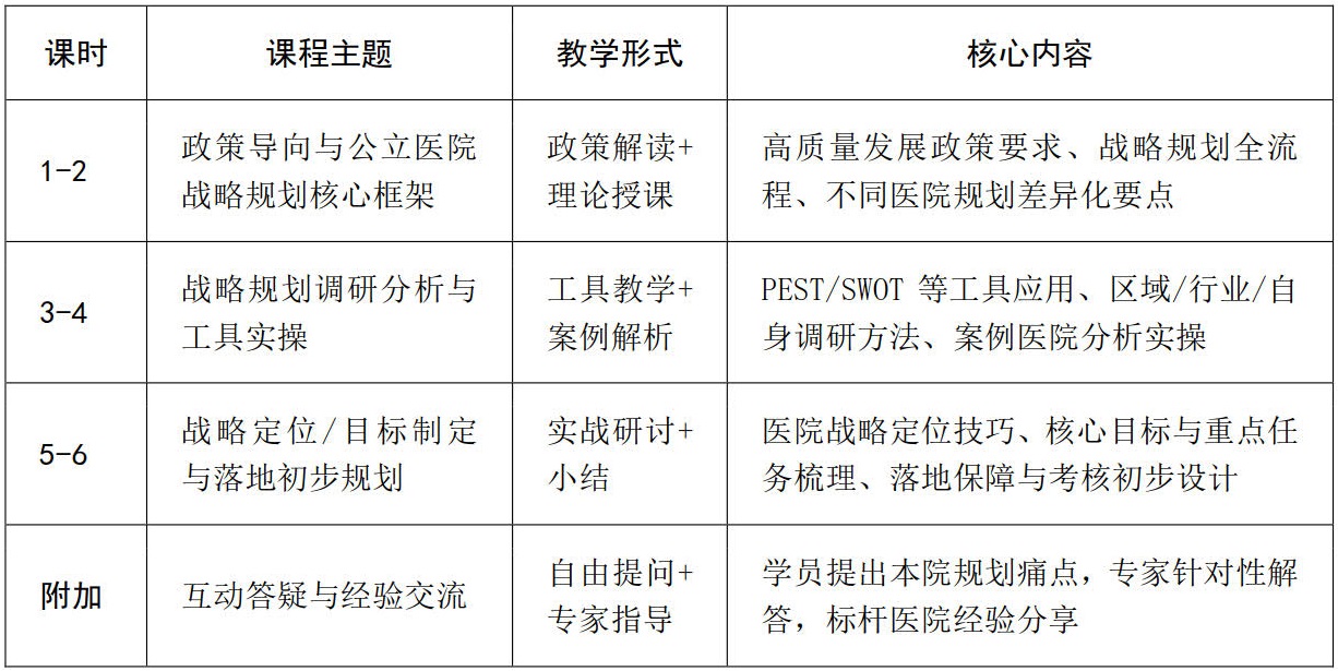培养医院管理团队的战略思维、规划能力、落地能力,使其熟练掌握公立医院战略规划的全流程方法、工具和实操技巧,能结合区域医疗环境、医院自身实际,制定科学可行、特色鲜明、可落地可考核的医院中长期发展战略规划,推动医院高质量、可持续发展。