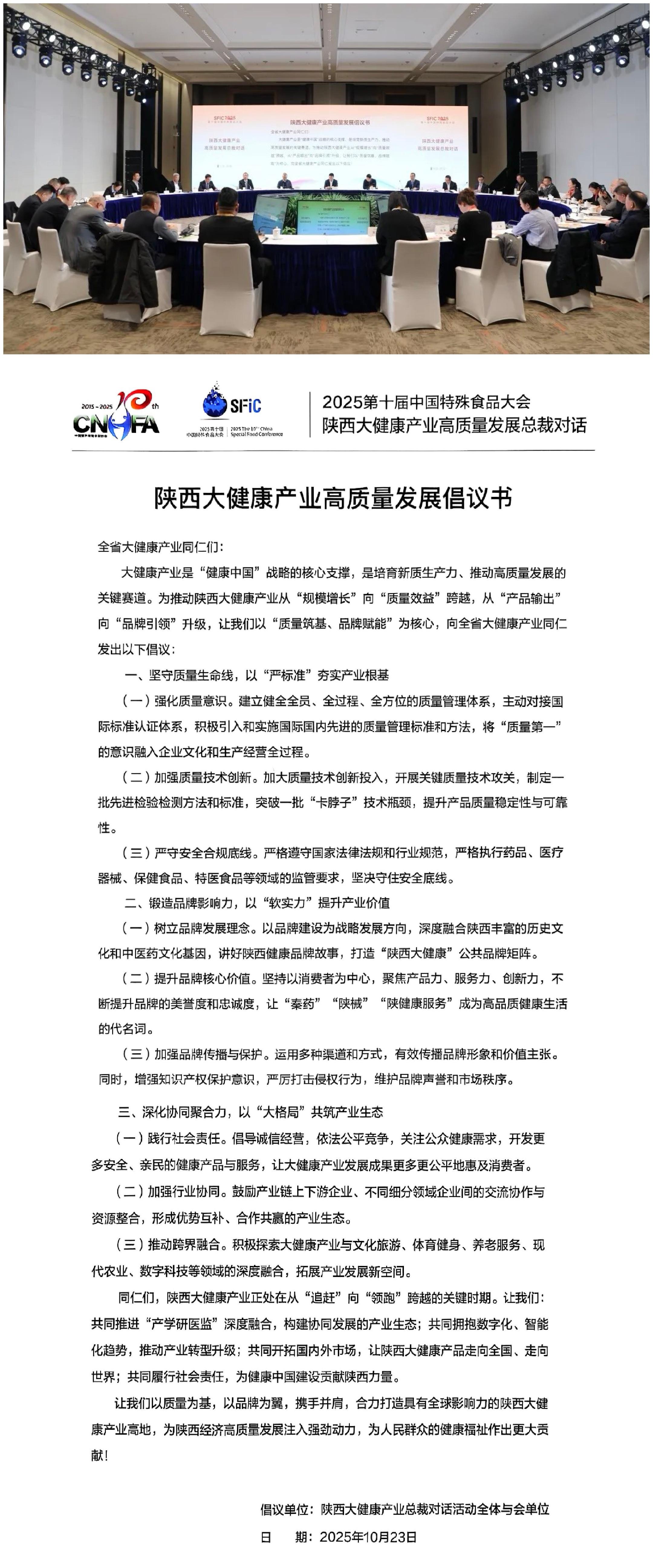 活动现场发布《陕西大健康产业高质量发展倡议书》,号召全行业坚守质量生命线,以“严标准”夯实产业根基;锻造品牌影响力,以“软实力”提升产业价值;深化协同聚合力,以“大格局”共筑产业生态。倡议书提出,要共同推进“产学研医监”深度融合,拥抱数字化、智能化趋势,开拓国内外市场,履行社会责任,为健康中国建设贡献陕西力量。