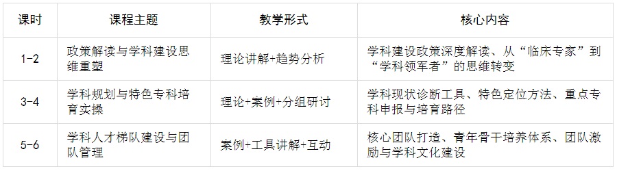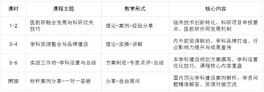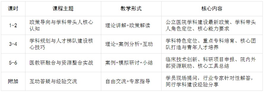 1.适配行业发展要求:紧扣公立医院学科建设评价、临床重点专科培育、医教研融合发展等政策导向,解决学科带头人“重临床、轻规划”“懂专业、弱统筹”的普遍痛点,补齐学科建设顶层设计能力短板。
