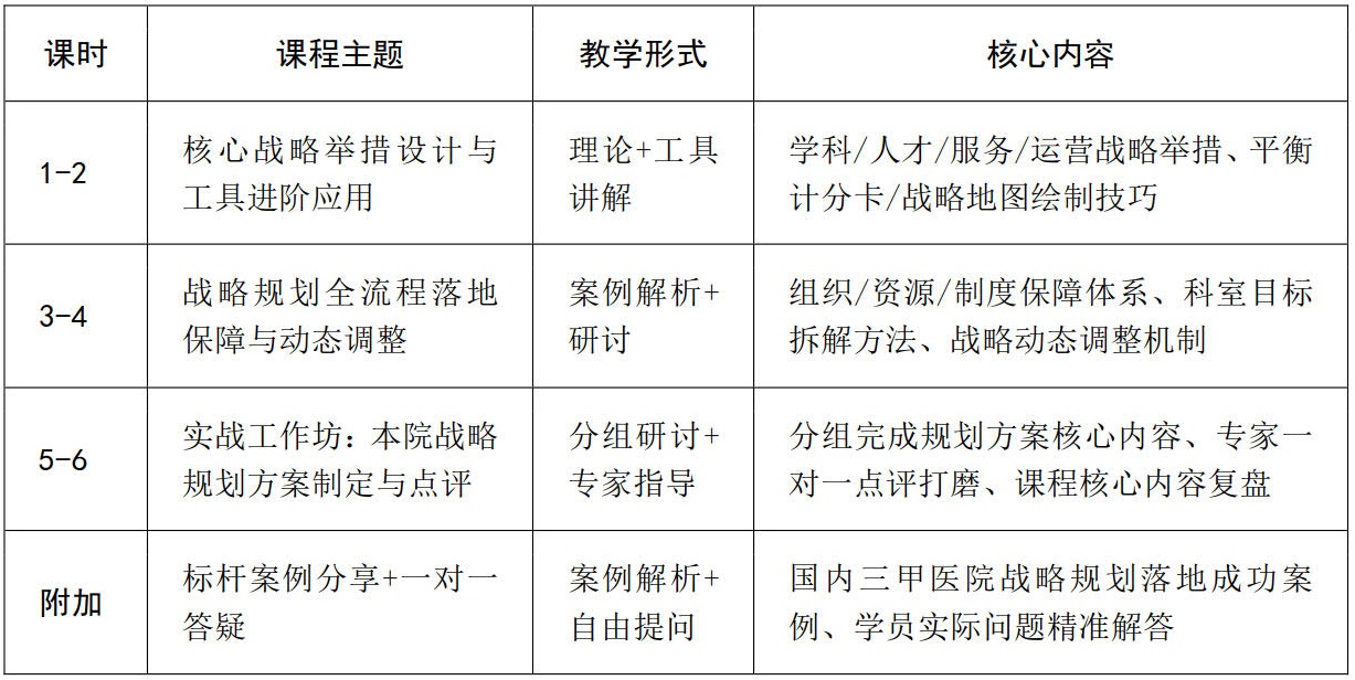 培养医院管理团队的战略思维、规划能力、落地能力,使其熟练掌握公立医院战略规划的全流程方法、工具和实操技巧,能结合区域医疗环境、医院自身实际,制定科学可行、特色鲜明、可落地可考核的医院中长期发展战略规划,推动医院高质量、可持续发展。