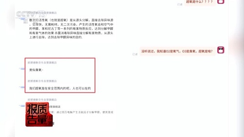 在网络平台,不少除醛仪产品宣称可利用臭氧除醛,部分商家还宣称“蓝氧除醛”“超氧除醛”,而且对身体无害。消协组织的工作人员以消费者身份咨询这款产品,客服介绍:超氧也是活性氧,类似臭氧,在安全范围之内。