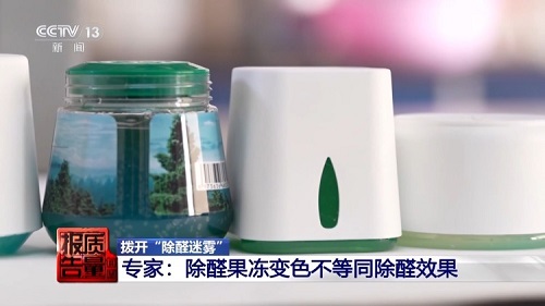 张正:宣传的问题最为突出,涉嫌夸大宣传。比如,宣传一个除醛果冻可以覆盖15平方米,除醛率99%,实际上所有的数据都是从实验室密闭的、小型实验舱得出的数据。